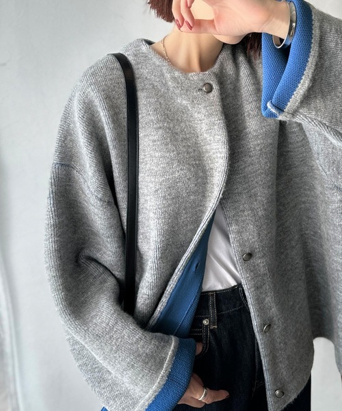 配色が映えるWフェイス配色ニットカーディガン。