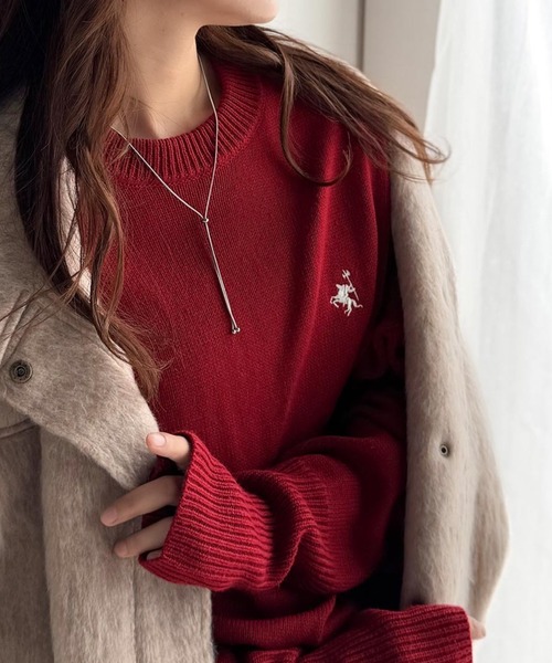 ゆったりとしたワイドシルエットに、さりげない胸元の刺繍が映えるシンプルなニットトップス。
