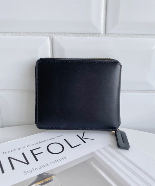 シンプルながら、ゴールドのファスナーが大人っぽい二つ折りウォレット。