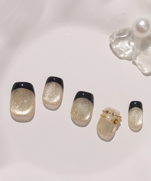 シンプルなブラックフレンチに、うるツヤ質感のゴールドマグネットとチェーンパーツを組み合わせた大人可愛いネイルチップ。