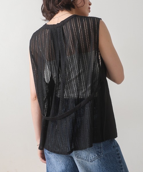 いつものコーデにプラスするだけでオシャレ感がUPするバックレースのジレ。細部までこだわり抜かれたデザインのジレが洗練された印象を与えます。後ろ身頃は透け感のあるレース素材で軽やかに仕上げ、後ろ姿まで抜け目ないデザインになっています。