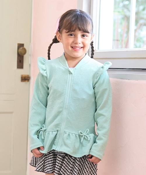 肩にあしらわれたフリルが華奢な印象を与え、裾のフリルはガーリーな雰囲気をプラスします。