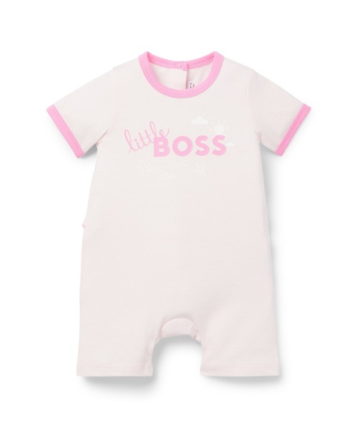 とてもやわらかなBOSSのベビー用ショートジャンプスーツ。ストレッチコットン生地で仕立てています。ロゴとアートモチーフをプリントし、背面にフリルのディテールを飾りました。