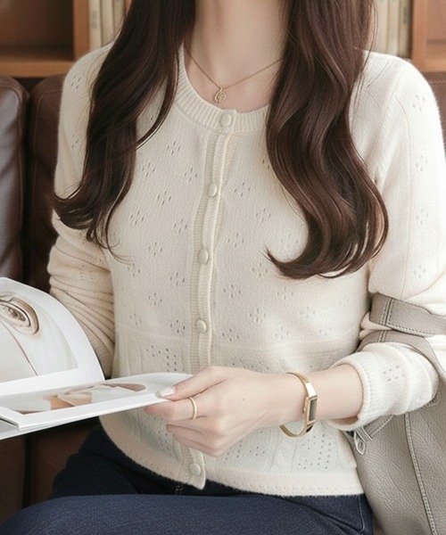 上品さと快適さを兼ね備えた、アイレット柄のニットカーディガン。