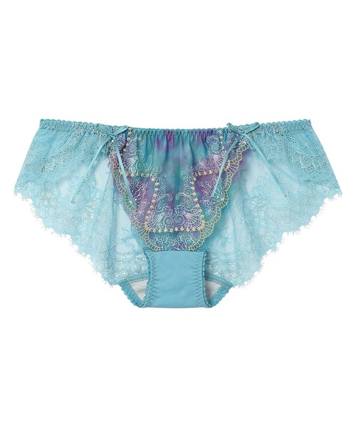 ●フロントに繊細なエンブロイダリーレースをほどこし、バックまで抜け感のあるレースをあしらった、贅沢な印象のデザインショーツ。