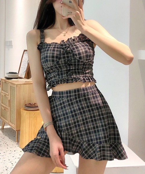 シックなチェック柄が印象的な、クラシカルなムード漂うセットアップスイムウェア。