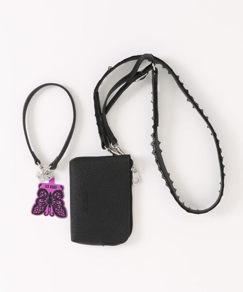 いろいろなデザインのスリングを展開し、スマートフォンが斜め掛け出来るようになるホルダーと、カードや小銭が入るポーチを付けました。