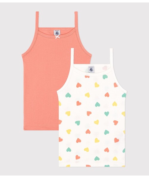 かわいらしいハート柄とシンプルなプレーンカラーで揃えたキャミソール2枚セットです。環境にやさしく、第二の肌と呼ばれるやわらかな手触りの1×1リブ編み素材を使用した快適な着心地が人気。首元にあしらわれたピコレースとリボンが、シンプルなデザインのアクセントに利いています。ご自宅用としてはもちろん何枚あっても嬉しいアイテムはギフトにもおすすめ。※濃色の製品は、摩擦や洗濯の際に色落ちや色移りをする場合があります。中性洗剤で単独洗いをしてください。