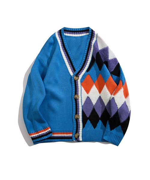 参考商品名:【HOOK】アシンメトリー カラフルなアーガイル幾何学模様リンガーカーディガン
