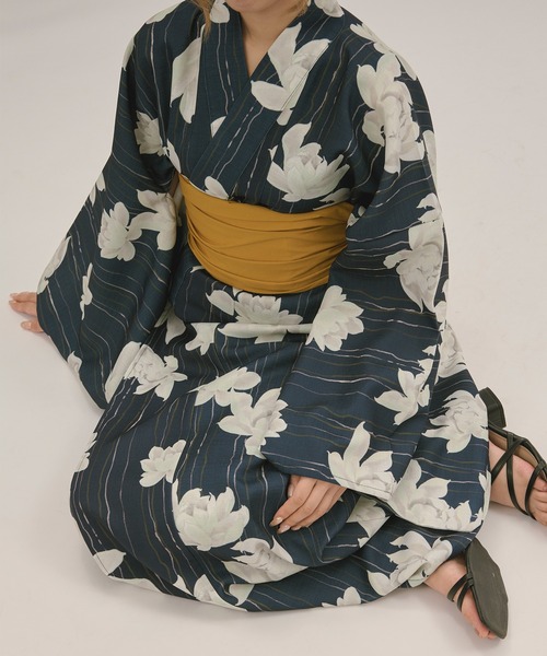 そのラインとリンクするようなマスタードカラーの帯が、統一感のある大人っぽいスタイリングを完成させます。