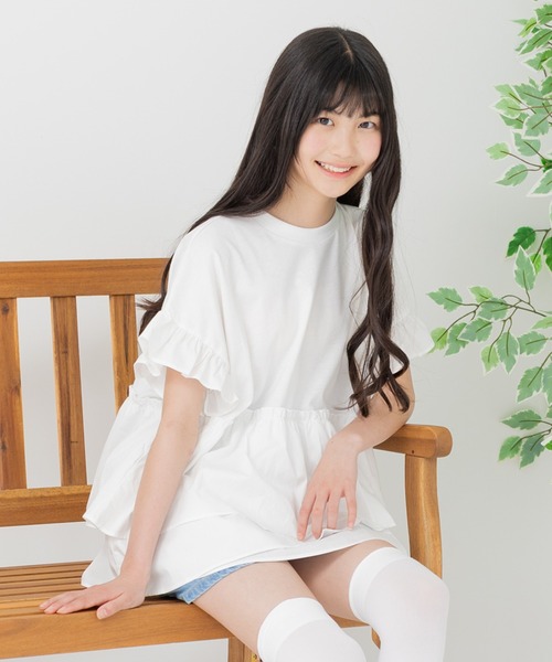 キーワード:チュニック キッズ 子供服 女の子 ショート ミニ丈 フリル 半袖 無地