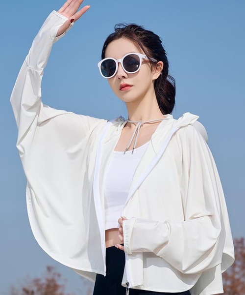 目元を残したフェイスカバーが叶うジップアップやバイザー付きのフードで、強い日差しはしっかりとカット。