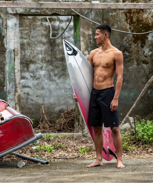 ヒップに大きくプリントしたQUIKSILVERロゴと、左裾のロゴネームがポイントのデザイン。