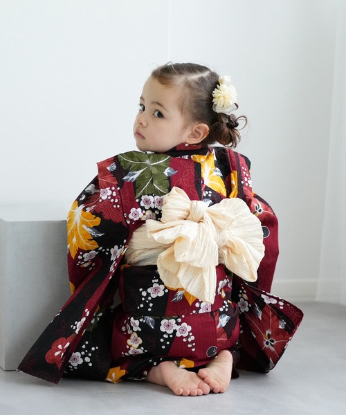 【ニコアンティーク kids 高級変わり織 子供浴衣3点セット 女の子 赤と黒の立沸とレトロ花】