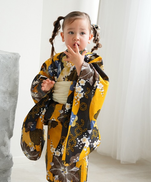 【ニコアンティーク kids 高級変わり織 子供浴衣3点セット 女の子 黄色と墨色の立沸とレトロ花】