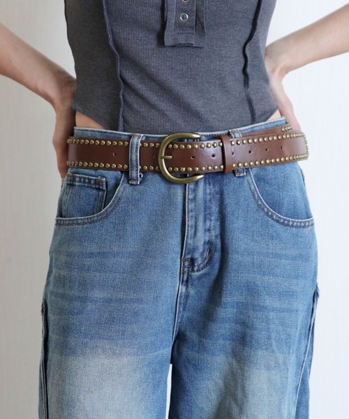 ベルト全体にスタッズを打ち込み、程よいハードさがトレンドライクな幅広ベルトに。
