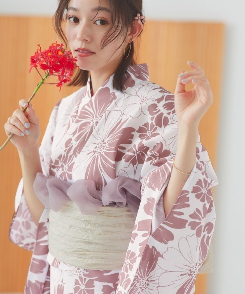 一人で簡単に着られるワンピースと上着のセパレートタイプの浴衣。しわ加工が施された兵児帯はシンプルに結ぶだけでも華やかな印象に。浴衣としてはもちろん、ワンピース単体で着られるところが魅力。浴衣としての着用とまた違った印象で普段着としても着回せます。