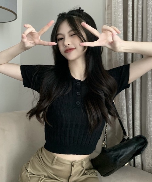 フィット感のあるリブ素材と、コンパクトなクロップド丈が魅力のポロトップス。
