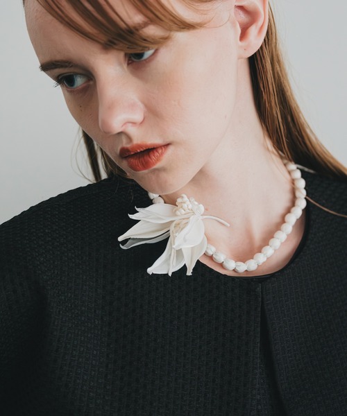 2wayシアーリーフネックレス&ブローチ 2way sheer leaf necklace/broochリーフデザインのブリーチと、パールのような光沢のあるファブリックで包んだネックレスのsetアイテムです。