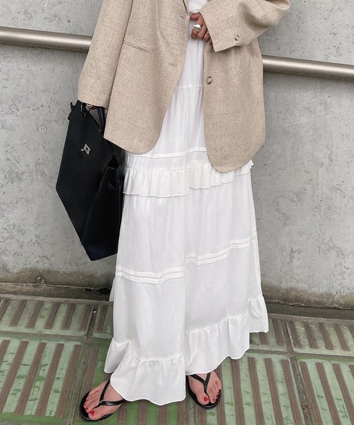 ややボリュームのあるティアードシルエットがふんわりと女性らしい雰囲気にしてくれます。