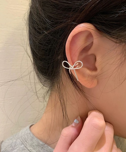 【立体リボンが耳元に映える、片耳用イヤーカフ】繊細なラインで形作られたリボンモチーフが、女性らしい柔らかさと程よい個性を演出。立体感のあるデザインが光を受けてきらめき、顔まわりを明るく見せてくれます。