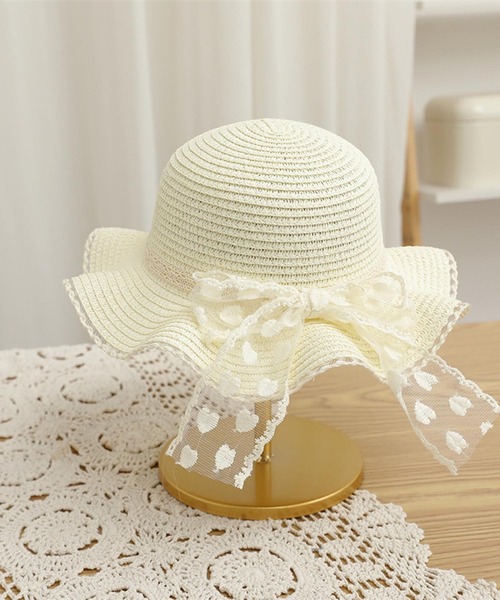 繊細なハート柄のレースリボンがアクセントの涼しげな麦わら帽子。