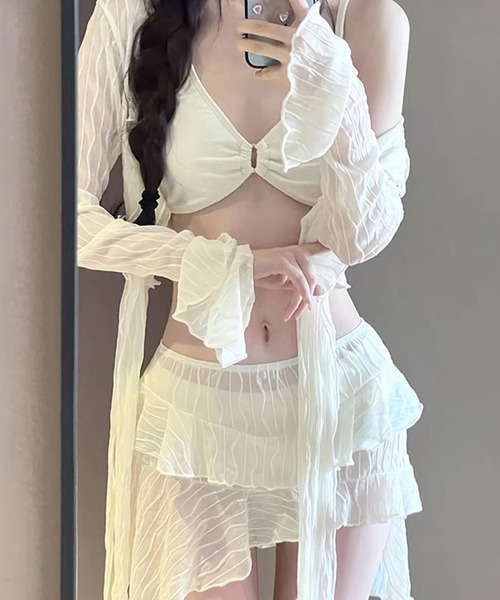女性らしいシルエットにこだわった水着に、ふわりと透けるシアーカーディガンをレイヤード。