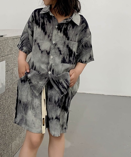 シャツは羽織としても使えるボックスシルエット。ボトムスはウエストゴムで履き心地が良く、腰紐付きで調整も簡単。タイダイのムラ感が一つひとつ異なり、個性が光るコーデが楽しめます。
