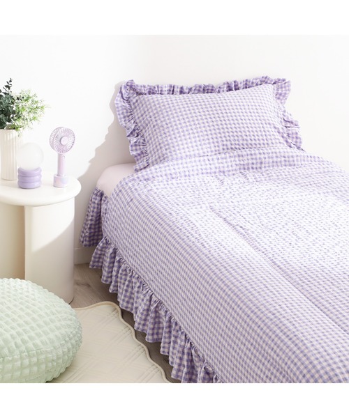 シアサッカー素材と周囲に施したフリルが夏らしく涼やかで華やかなベッドコーディネートを叶えてくれます。