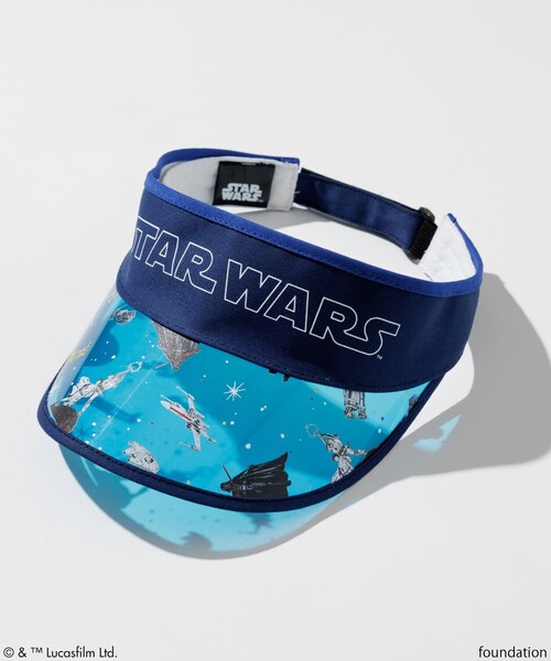 『スター・ウォーズ /新たなる希望 (エピソード4) 』より、額部分にロゴを配し、宇宙をイメージしたクリア素材の青いツバ部分には「ダース・ベイダー」、「C-3PO」、「R2-D2」、「レイア・オーガナ」、「ルーク・スカイウォーカー」といったメインキャラクターのほか、「スターファイター」や「タイ・ファイター」、「ミレニアム・ファルコン」が飛び交い、さらには「デス・スター」もプリントされた、ヴィンテージ感漂うサンバイザー。
