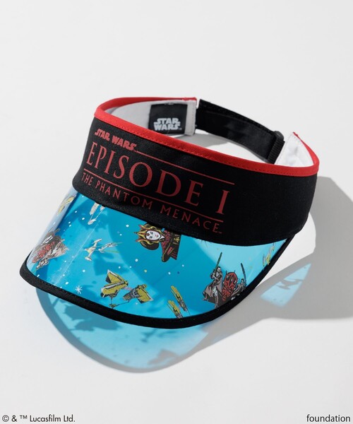 『スター・ウォーズ/ファントム・メナス (エピソード1)』より、額部分にロゴを配し、宇宙をイメージしたクリア素材の青いツバ部分にはイラストの「パドメ・アミダラ」やダース・モール」と「オビ=ワン・ケノービ」、「クワイ=ガン・ジン」。さらに「ポッドレーサー」や「ナブースターファイター」が飛び交うヴィンテージ感漂うサンバイザー。77年に「エピソード4」が公開されたタイミングで発売されたであろうサンバイザーを再現。クラシカルな雰囲気がマニア心をそそります。