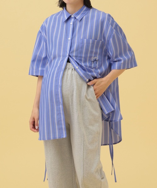 サイドは絞ったり、そのまま紐を垂らしたりとお好みのシルエットで着用できるシャツです。前開きなので羽織りとしても使え、産後の授乳の時にも着やすいデザインになっています。