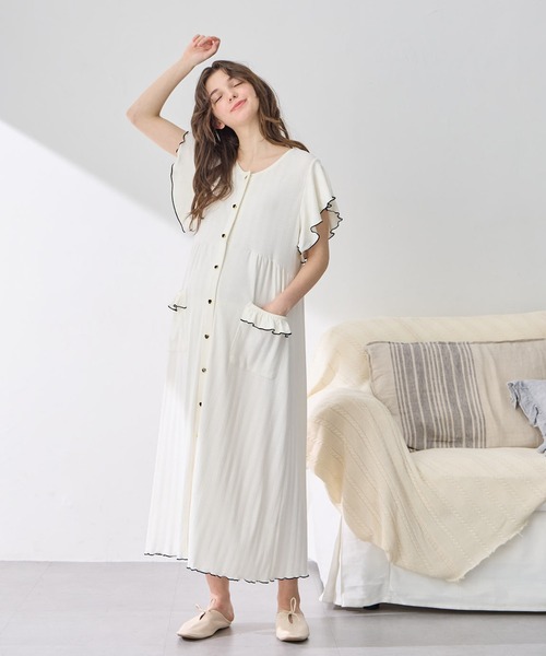 商品名:配色メロウフリル パターンメッシュネグリジェ/ ワンピースパジャマ(産前・産後対応 マタニティ&授乳服 ルームウェア)