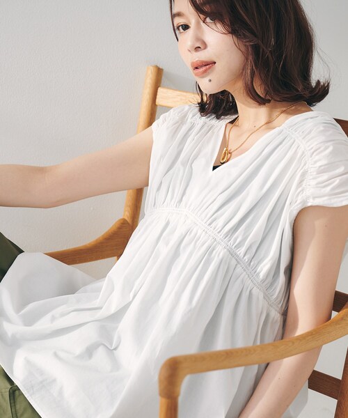 胸元と肩のシャーリングがポイントのギャザーブラウスは、程よく体から離れる風の通るシルエットで暑い季節にもピッタリなブラウスになっています。