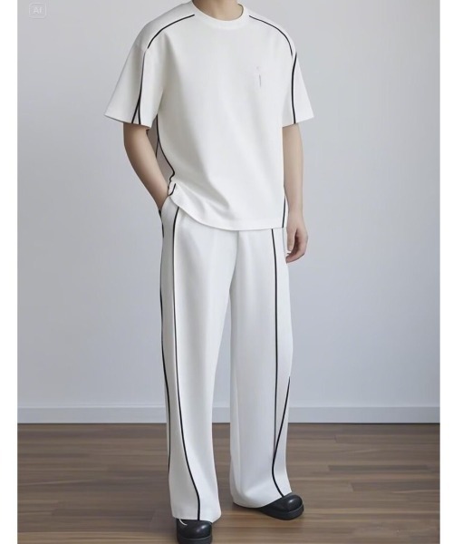 ミニマルで洗練された印象を与える、パイピングライン入りの上下セットアップ。トップスとパンツ両方に施されたコントラストラインが、視覚的な縦長効果と立体感を演出。