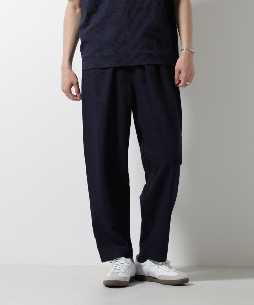 凸凹のサッカー素材が汗をかいても生地が肌につきにくく、快適な着用を提供するワイドテーパードパンツ。カジュアルなイージー仕様ながらも加工や生地感で、きちんと見えも叶えるアイテムです。