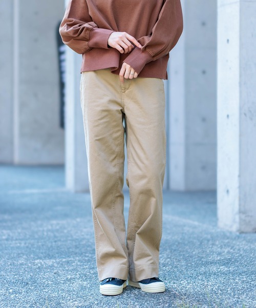 程よくゆとりを持たせたストレートライン。コシ感のあるチノ生地はヒップや太ももを拾いにくく美しいラインをキープすることでスタイルアップ効果も!腰回りはスッキリとしたサイズ感で、股上は浅めに設定したトレンドレスなバランスの良いデザイン。世代問わずに着用ができます。