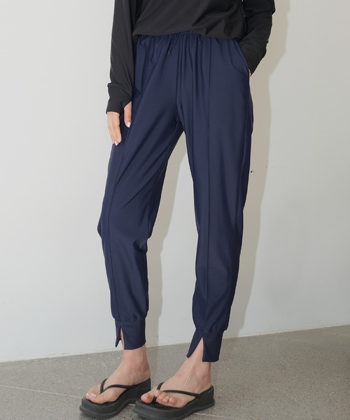 ジャージとレギンスを混ぜたようなニュアンスになっており、ラインを拾い過ぎないシルエットが◎