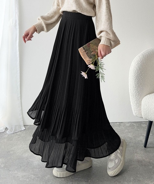 歩くたびにふわっと揺れるシアーな質感が目を惹く、プリーツシアーティアードスカート。