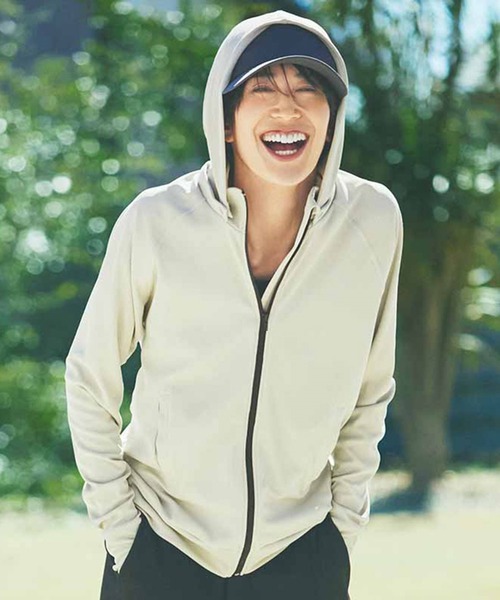 ―コメント:接触冷感とUVカットのしなやかなリブ素材。フードを外してスタンドカラーにも。