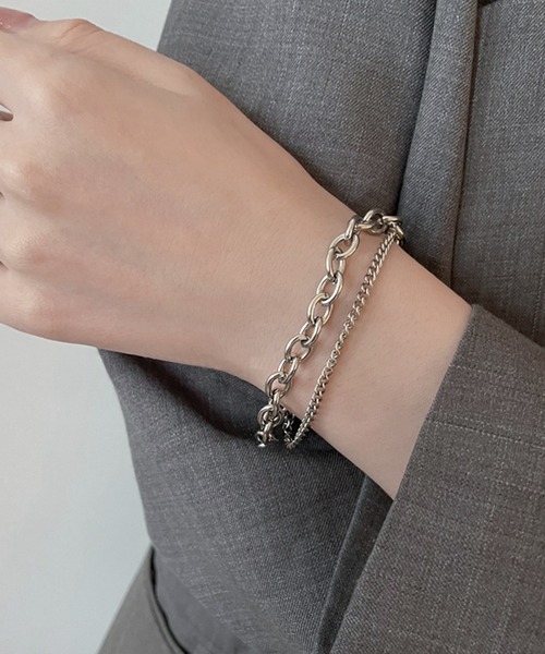 無骨な太めチェーンと繊細な細身チェーンを組み合わせた、存在感のあるシルバーブレスレット。