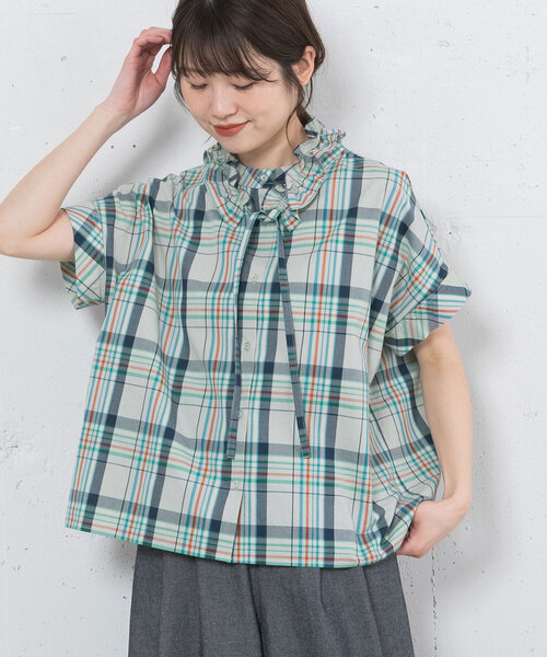 パッと目を惹くオリジナルのマドラスチェック柄のブラウス。多色使いながらもまとまったカラーリングで落ち着いた雰囲気に仕上げました。程よく首から離れたスタンドカラーがきちんと見えするデザイン。身頃続きの袖もゆったりとしていて涼しく着られます。フルオープンで羽織りとしても使えます。