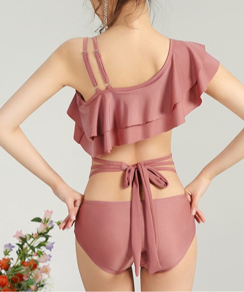 【大人フェミニンな印象のワンショルダーフリル水着】上半身に施された立体的なフリルが、気になる部分をふんわりカバー。肩のストラップとワンショルダーのデザインが、女性らしいシルエットを引き立てます。さりげない肌見せがヘルシーで、リゾートからプールまで幅広く活躍するアイテムです。