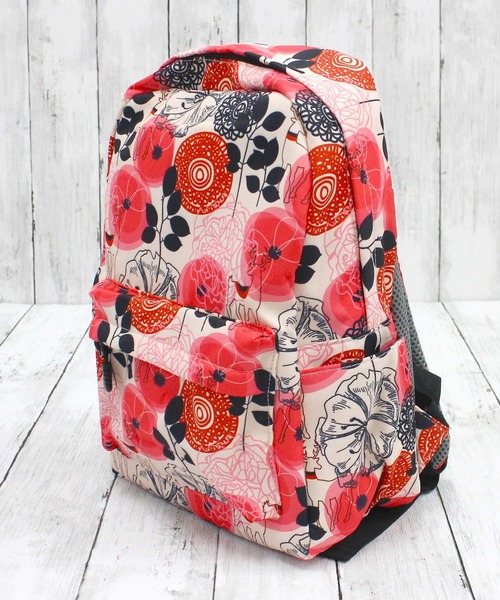 小ぶりなサイズ感がかわいい『総柄リュックサック 』財布やスマホなどの貴重品からペットボトルまで収納できるちょうどいいサイズ感のバックパック。
