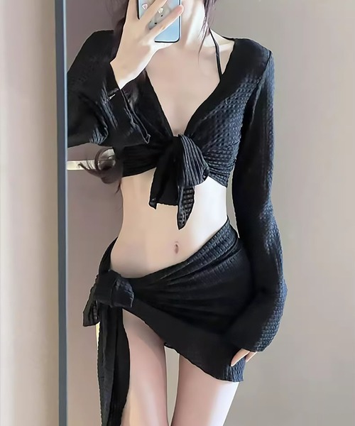 【着回し自在な4点セット水着でトレンド感をプラス】ビキニ上下に加え、メッシュトップスとスカート風ショートパンツがセットになった4ピース仕様。露出を調整できるため、シーンや気分に合わせて自由にコーディネートが楽しめます。