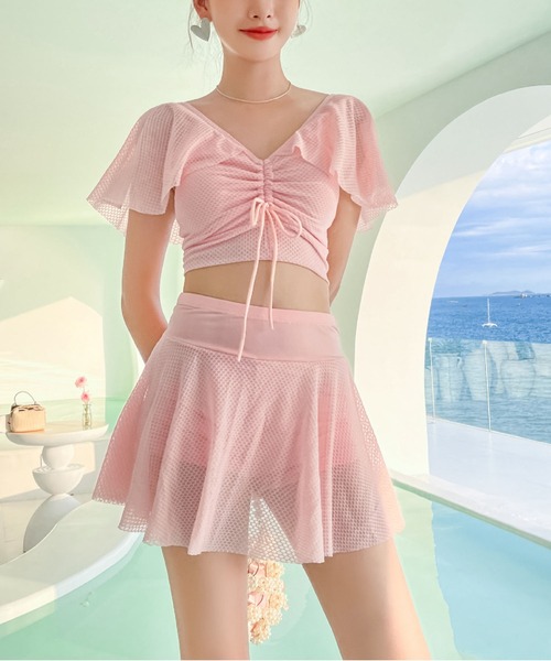 【着映えも実用性も兼ね備えた3点セット】ビキニ上下に加え、透け感のあるトップスでワンマイル仕様にも。可愛らしさと機能性を両立したデザインで、写真映えも抜群の一着です。