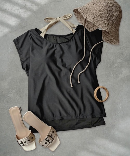 ホルターネックの水着を中に着ているかのようなデザインになっていますが、実際はトップスと一体型。