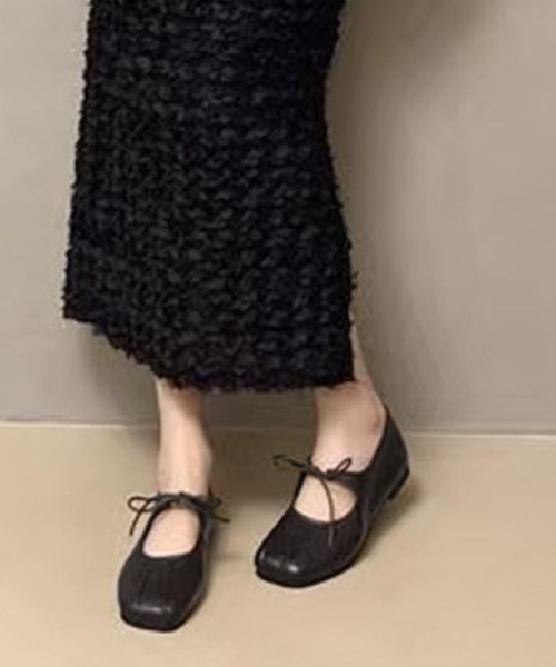 スクエアトゥに可愛らしいリボンを添えたクラシカルな雰囲気のフラットシューズ。柔らかい素材と足に馴染むシルエットで快適な履き心地。