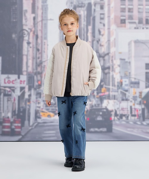 【仕様】袖の切り替えにボアを使ったデザインで袖口は編立リブで寒い日の風をシャットアウト。ディティール、トレンド感にこだわったMA-1は110〜140サイズ展開の重宝する一着です。