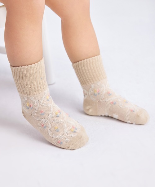 【素材】オールシーズンに着用しても心地よい素材をセレクト【柄】表情豊かな斜め格子のフロート編み(凹凸編み)の中に2色の小花の柄を合わせました。【仕様】履き心地と脱げにくさの両面でベビーキッズの足をサポートします。履き口はソフトなリブで履きやすく、かかと部分はY字ヒールで脱げにくい仕様になっています。【備考】滑り止め、ネーム欄付き【クリーニング】洗濯機洗い可【裏地】なしモニター・環境等により実際の商品と色味が多少異なって表示される場合がございます。 また、生産時期により色味が若干異なる場合がございます。予めご了承ください。